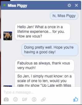 If the specialized app landscape is shrinking, bot integration will make the appeal of more widespread apps broader. Clearly the landscape is changing for mobile interactions, and bots are part of the trend. Watch for a bot talking back to you on Slack or in a chatroom in the near future! Or head over to Miss Piggy’s page on Facebook and have a chat with her there, right now!