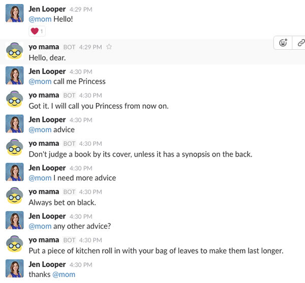I have a lot of plans for @mom. At some point, she might be released as an installable Slack app. What are you currently building for your teams? Do you find Slack bots helpful or annoying? Where do you see bots headed in the future? Tell me in the comment section below.