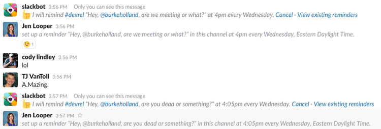 Note: You may not need to create a custom bot at all. Slack has a dizzying variety of commands you can use to interface with its built-in SlackBot. Slash commands, like /remind, tell it to set up reminders to either a user or a channel, for example to managers who tend to be late to team meetings:
