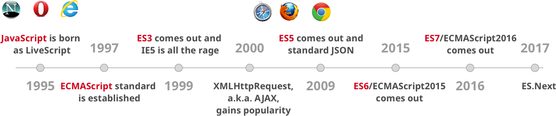Since JavaScript conception on 1995, it has been evolving slowly. New additions happened every few years. ECMAScript came to be in 1997 to guide the path of JavaScript. It has been releasing versions such as ES3, ES5, ES6 and so on.