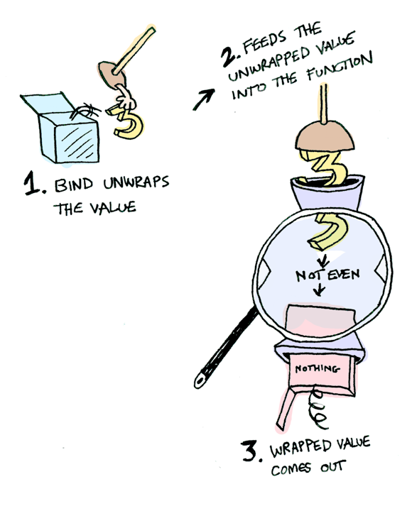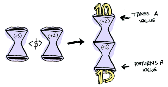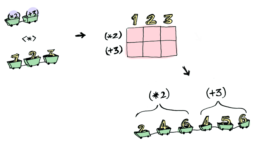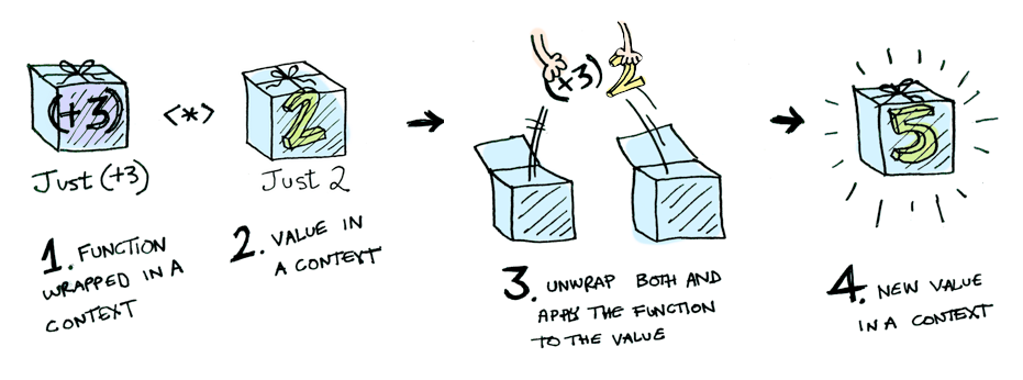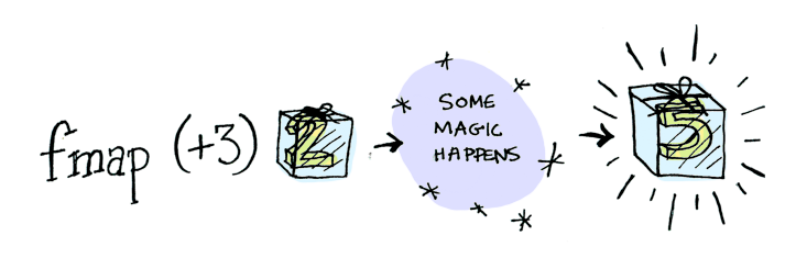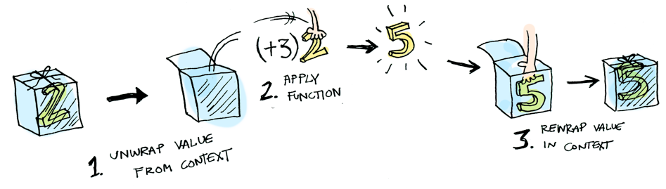 This is where map (fmap in Haskell) (<$> in Haskell) comes in. map is from the street, map is hip to containing box. map knows how to apply functions to values that are wrapped in a box. For example, suppose you want to apply a function that adds 3 to the wrapped 2 and assume there’s a map function exist: