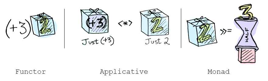 Now when you apply a function to this value, you’ll get different results depending on the containing box. This is the idea that Functors, Applicatives, Monads, Arrows etc are all based on.