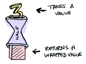 Simple enough. Lets extend this by saying that any value can be in a context. For now you can think of a context as a “box” that you can put a value in: