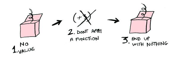 //=> []It does end up with nothing. To illustrate it doesn’t apply a function at all, we tweak the function a bit: