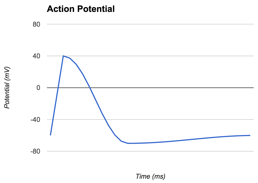 As I’ve described above, real neurons don’t behave that way. Instead, synapses transmit fluctuating continuous value potentials over time through the soma (cell body) to the axon hillock trigger zone where the sum of the signal may or may not trigger an action potential at any given moment in time. If the potential in the soma remains high, pulses may continue as the cell triggers at high frequency (once every few milliseconds).