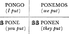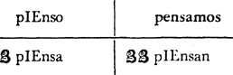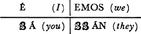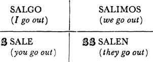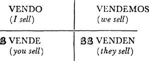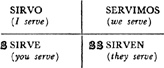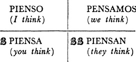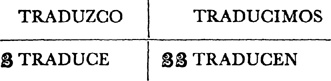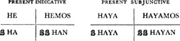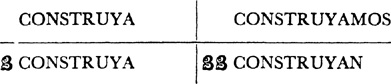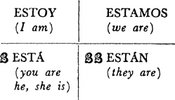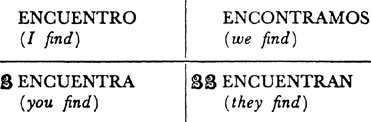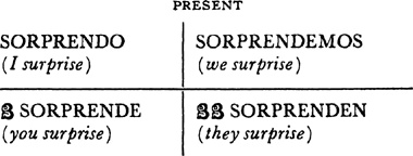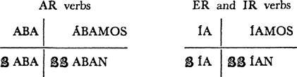 Present tense, singular, ar verbs, 22.1; singular, er and ir verbs, 23.1; plural, ar, er, ir verbs, 24.1; present tense of irregular (nonconformist) verbs, 31.1