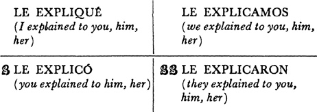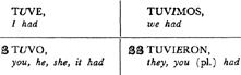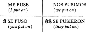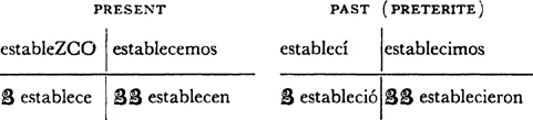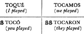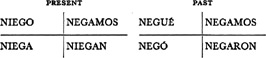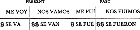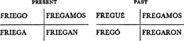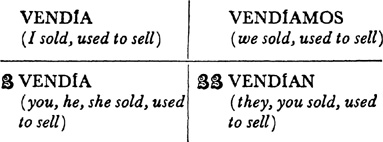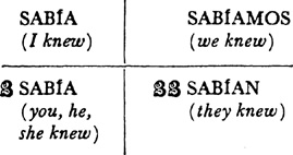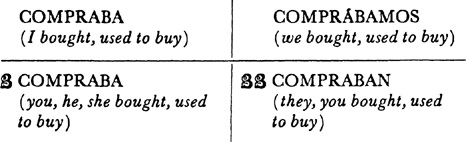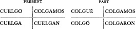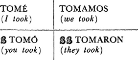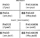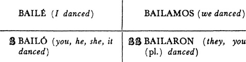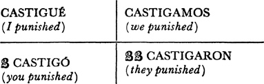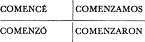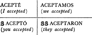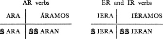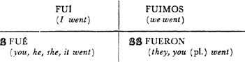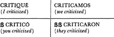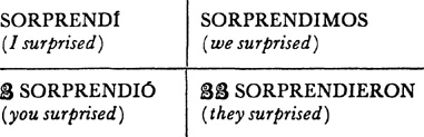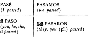 Past (preterite) tense, ar singular, 3.1, 6.1; er and ir singular, 14.1; ar plural, 17.1; er and ir plural, 18.1; past of irregular (nonconformist) verbs, 31.1