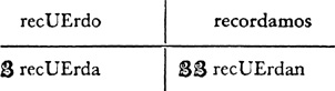 Tenses, see Tenses and moods; reflexive, see Reflexive; radical-changing, see Radical-changing verbs; spelling changes in verbs, see Orthographic-changing verbs; irregular verbs, see Nonconformist (irregular) verbs; verbs which end in uir, 44.1, 44.2; verbs which end in cir, 36.1; verbs which end in cer, 37.1; uses of verbs which end in cer, 37.2, 37.3; impersonal verbs, 44.3, 44.4; how to form verbs from nouns which end in ión, 8.1; verb review, 29.1; sample ar verb, 29.2, 29.3; sample er verb, 29.4, 29.5