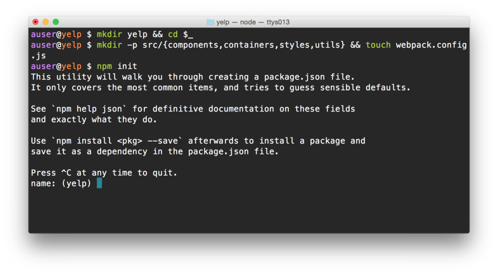 && touch webpack.config.jsIn the same directory, let’s create our node project by using the