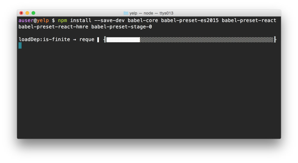 npm install --save-dev babel-core babel-preset-es2015 babel-preset-react babel-preset-react-hmre babel-preset-stage-0