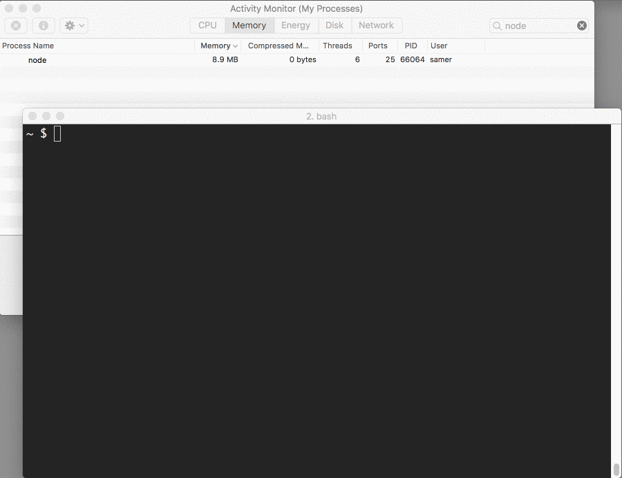 server.listen(8000);Now when you connect to this server, a magical thing happens (look at the memory consumption):