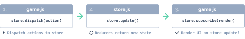 };In the above case I’m doing it slightly different compared to store.subscribe(render) in Redux. I’m actually triggering a global event and letting game.js render the callback whenever necessary.
